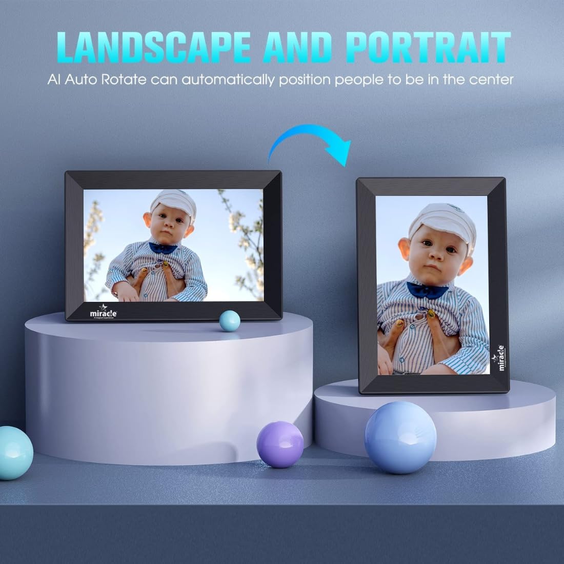- The Digital Photo Frame comes with an Auto-Rotate Feature, which automatically rotate photos to adjust the direction. This Smart Photo Frame also offer a variety of settings which can be customized, including sleep mode, display brightness, auto-advance timing, captions on/off, image placement adjustment, and more