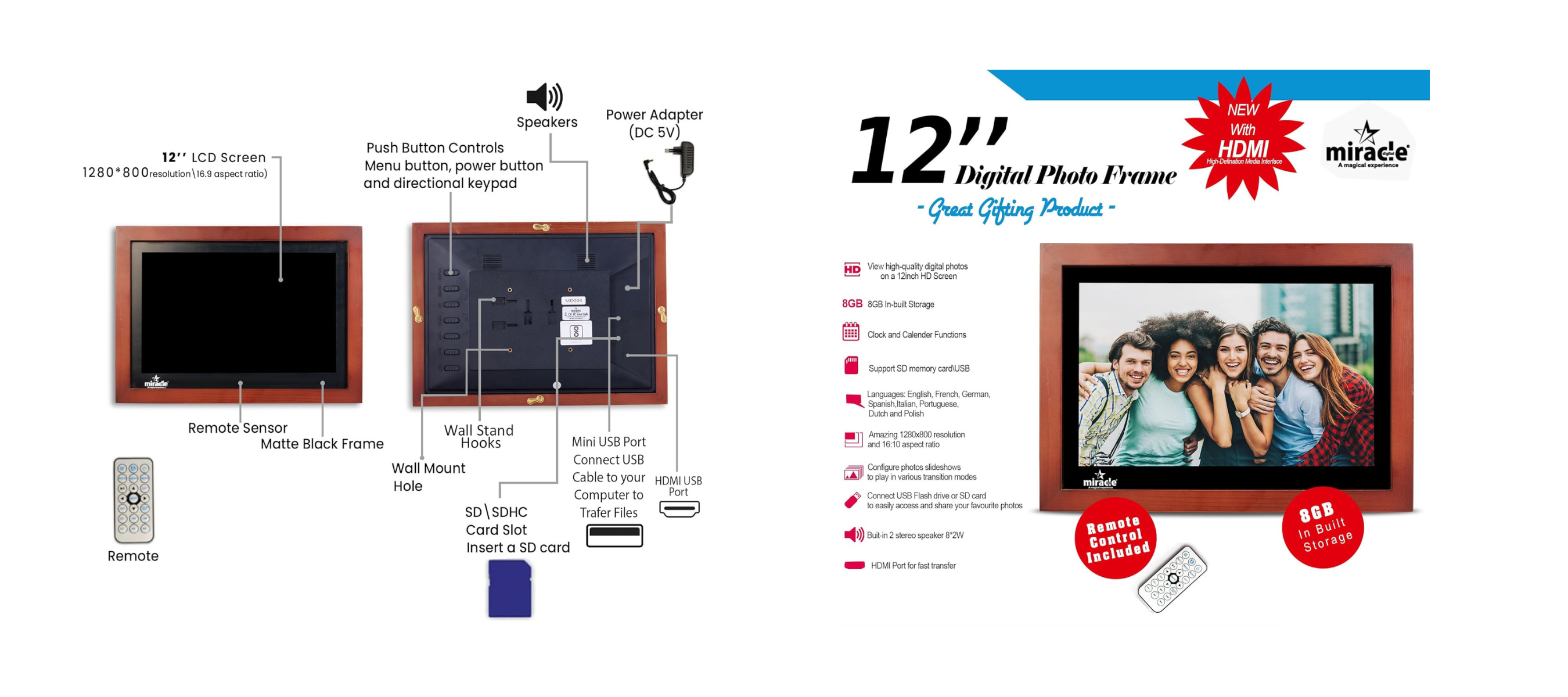 Miracle Digital 12" Wooden Dark HDMI Photo Frame, Premium Mirror Finish, Hi-def Display, 8GB memory, 2GB RAM, 2 Stereo Speakers.