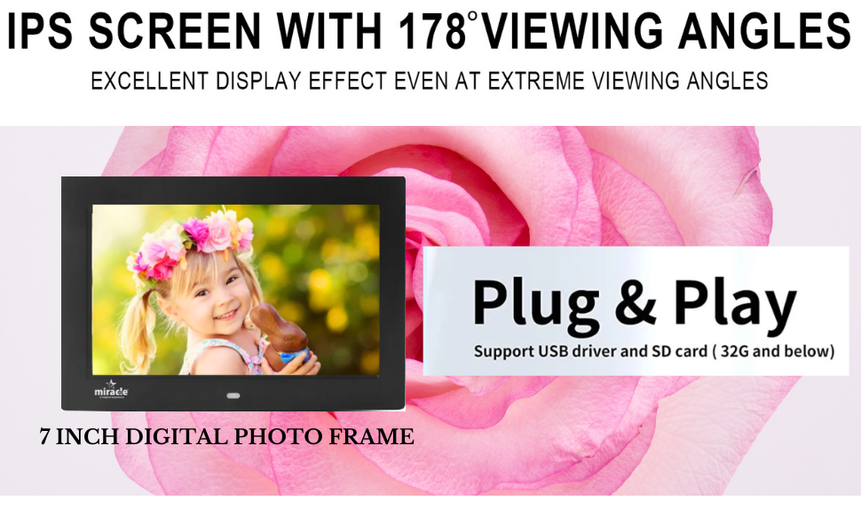 - ★ Design your home/office with Miracle digital 7 Inch IPS LED Digital Photo frame, which comes with loads of features. This Digital Photo Frame comes with multiple play format, so just plug and play. It plays Photo, Video and Music. Comes with Functionality of slideshow of photo with Music, which further add good ambiance to your lovable memories.