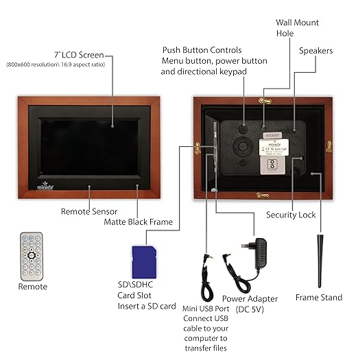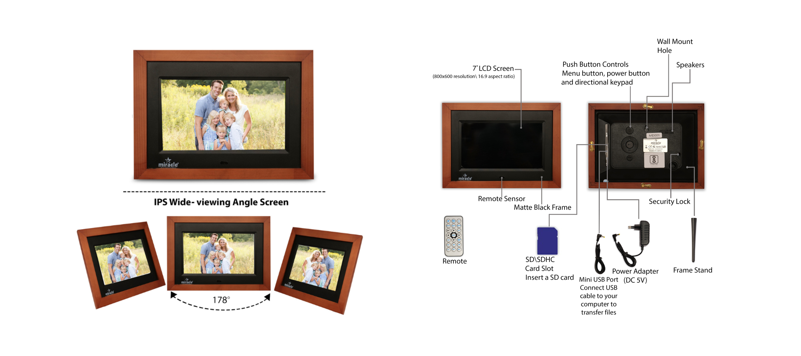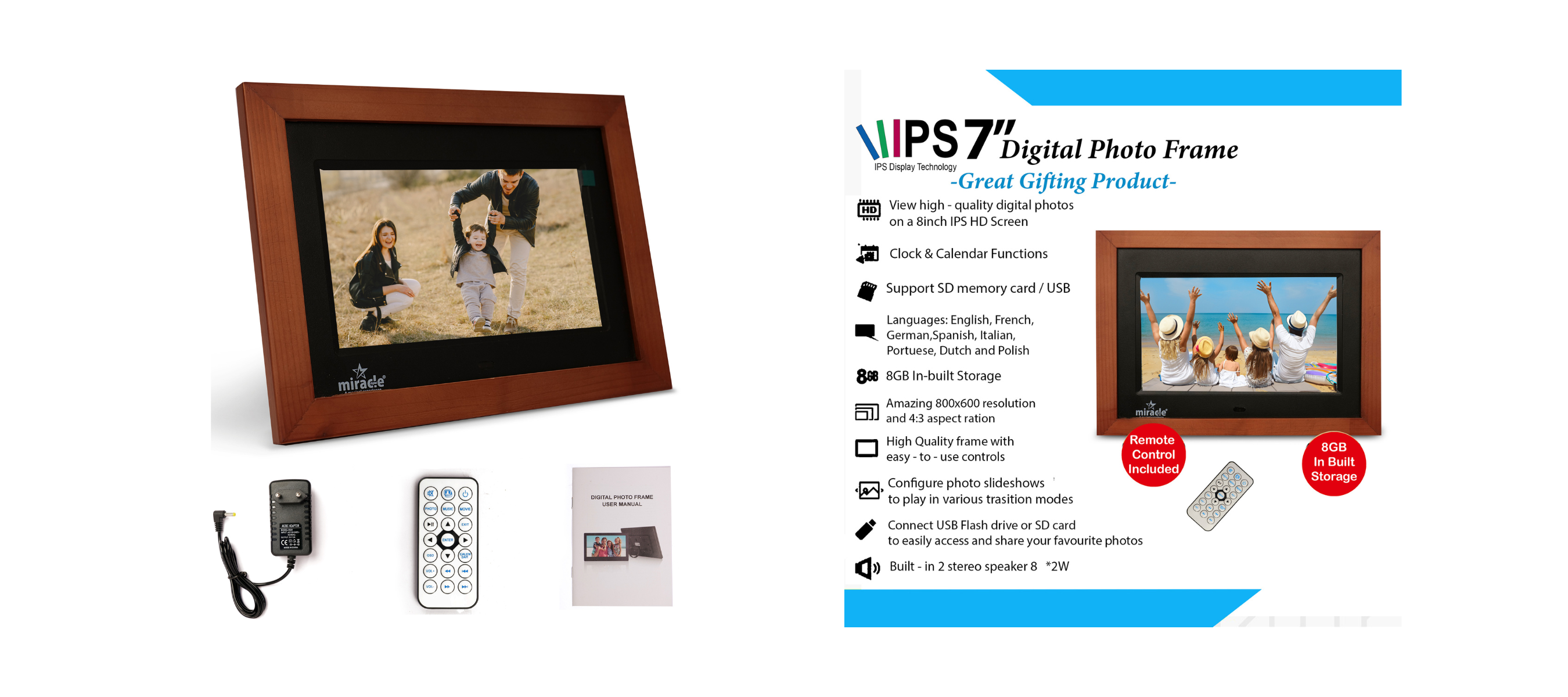 - ★ Design your home/office with Miracle digital 7 Inch IPS LED Digital Photo frame, which comes with loads of features. This Digital Photo Frame comes with multiple play format, so just plug and play. It plays Photo, Video and Music. Comes with Functionality of slideshow of photo with Music, which further add good ambiance to your lovable memories.