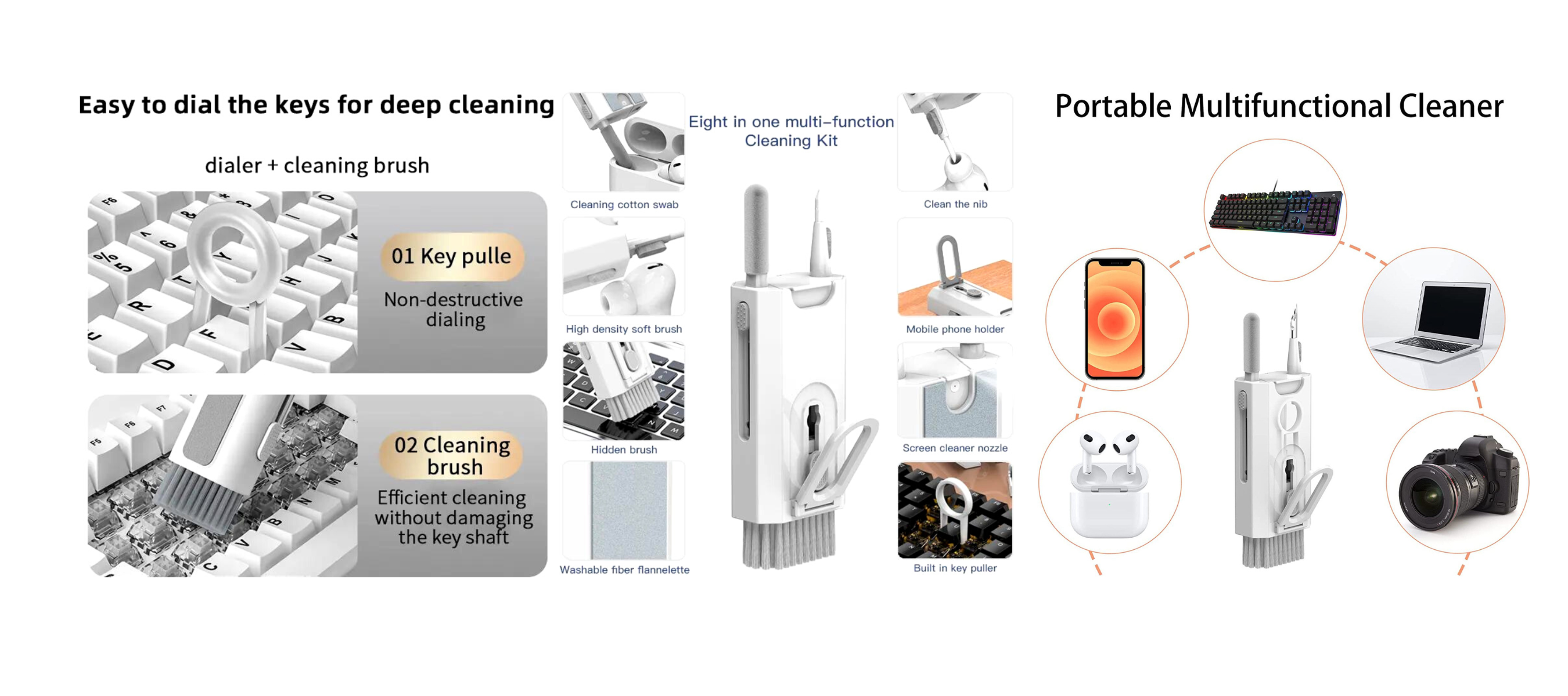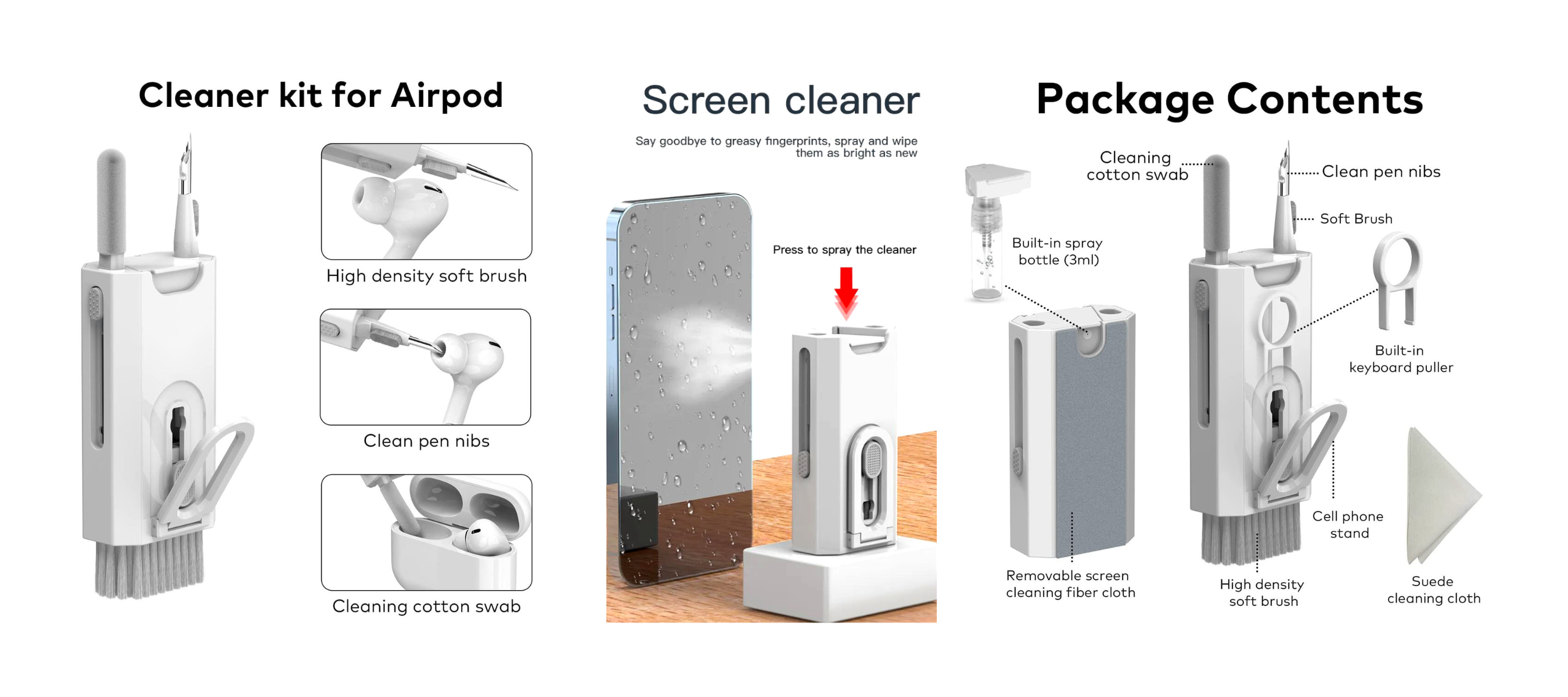 Miracle Digital 8 in 1 Multifunctional Cleaner Kit electronic cleaning kit includes a cleaning pen for air pods with silicone Nip ,mini Brush and Flocking sponge Brush, high-density soft brush, cleaning spray bottle(empty),fiber fleece swipe and keycap buckle. The kits can clean headphones, keyboards ,PC monitors ,phones, Cameras. This cleaner kit use for Laptop, Computer, Tablet, Keyboard Cleaning Slide the large high-density soft brush to clean the dust off the computer, laptop, tablet and keyboard. And you can also use the key puller to pull up the keys of the mechanical keyboard to do. a deep cleaning. The small high-density brush is great for deep clean mesh surface dust. The flocking sponge is to clean the hole of the charging case. This cleaner kit ,Soft Brush Does Not Hurt Keyboard, Special selection of Nylon brush with moderate softness and hardness, three row design with high pore strength, good elasticity, stiffness and compactness, more labor-saving friction. Monitor screen, Camera ,Watch ,TV Cleaning - including with a 5ml spray empty bottle, you put cleaning liquid or water into the bottle and use the fiber fleece swipe to clean various screens. For example, monitors, televisions, monitors, watches, The cleaning brush can be used to clean the surface dust and garbage of the keyboard and other object. open the phone stand to turn into a desktop stand.